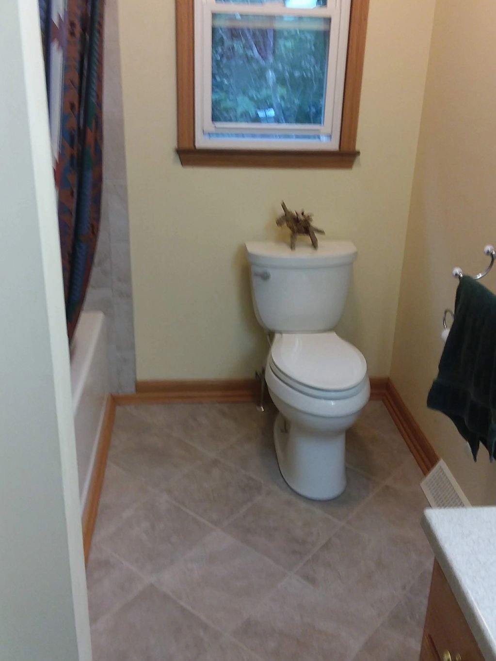 Repaired soft subfloor and added porcelain floor tile set on diagonal; faux-oak molding. Saratoga Springs, NY