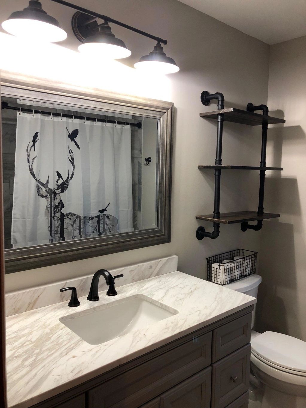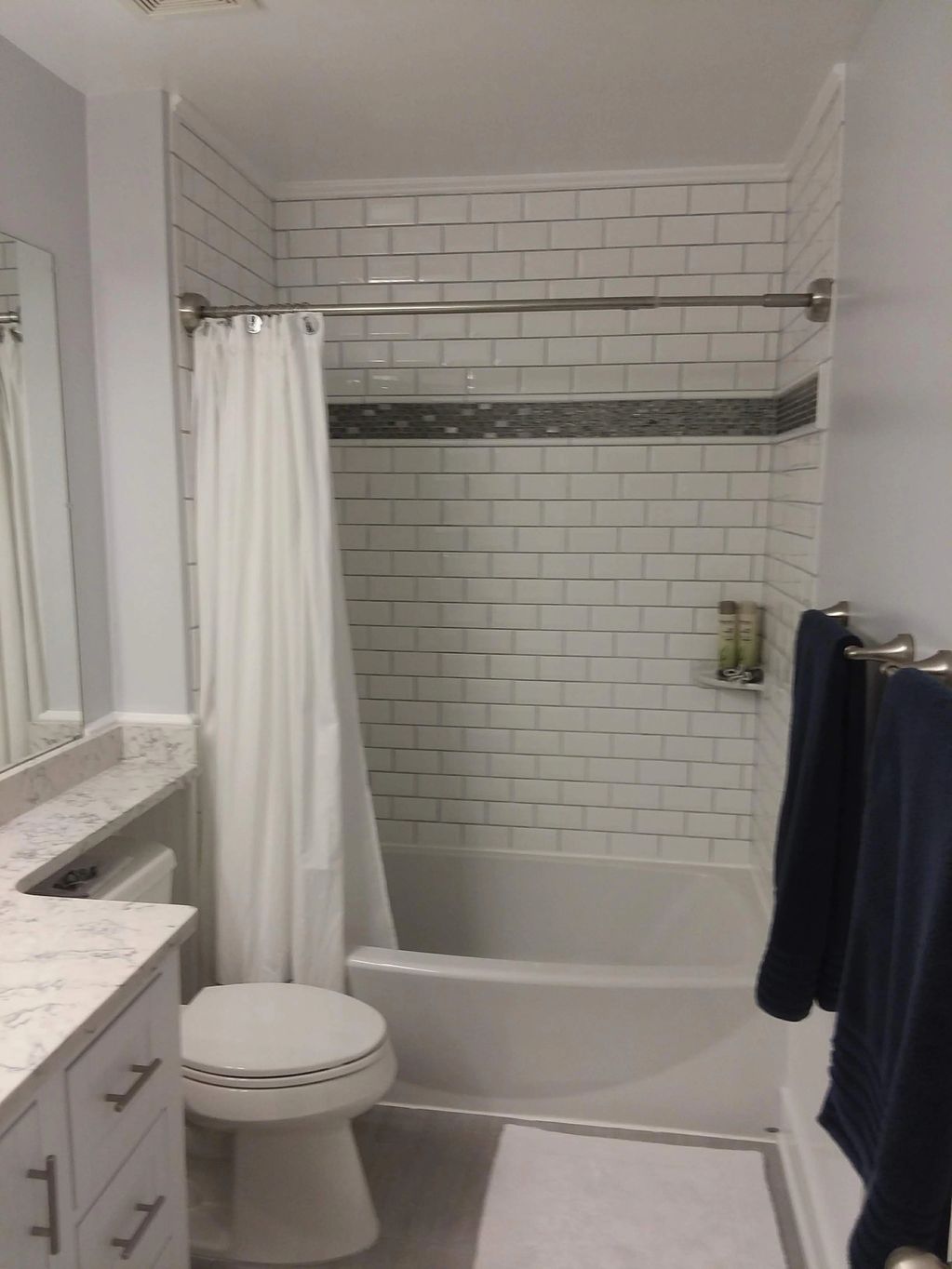White subway tile with gray glass decorative accent and marble pencil tiles; Delta faucets and fixtures; custom quartz countertop; porcelain woodgrain floor tile. Washingtonville, NY