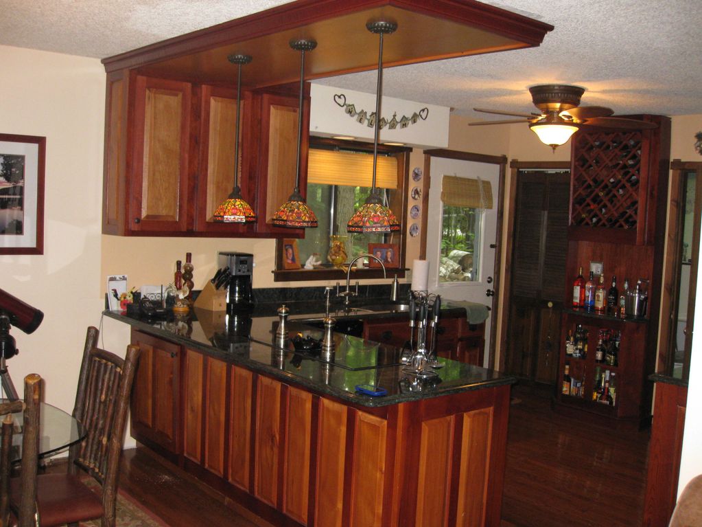 Handmade rustic kitchen in chestnut and maple; Brazilian granite. Custom wine rack. Bolton Landing, NY