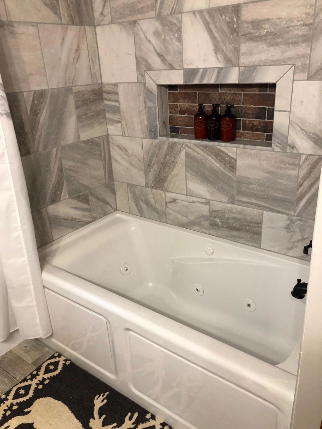 Faux marble porcelain tiles with custom wall niche and marble shelf; American Standard whirlpool tub; woodgrain porcelain floor tile; Delta faucets and fixtures. New Hampton, NY